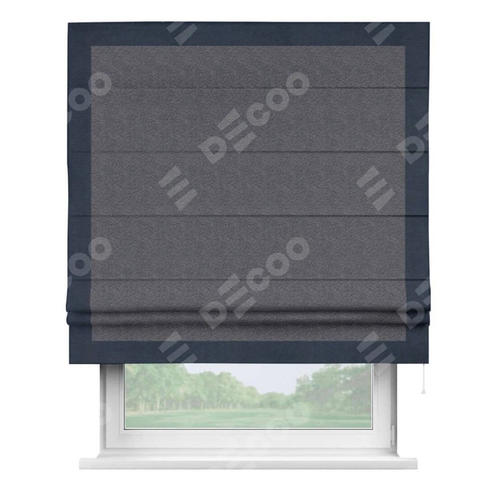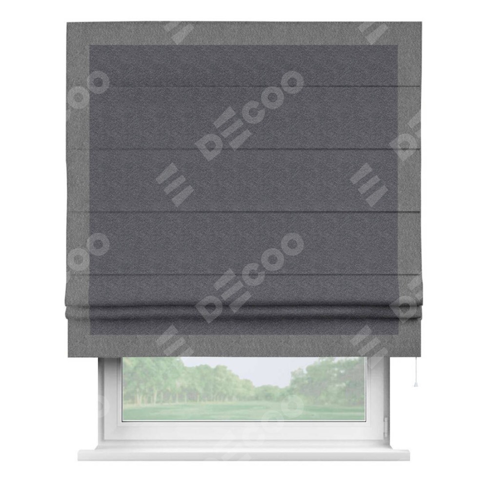 Римская штора производителя «Cortin», используется для проёма, пошита из ткани софт однотонный графит, артикул 19316. Отделка шторы кантом «Чесс», ткань для канта используется из софта разной расцветки на выбор. Имеет универсальный механизм и подходит для монтажа: на потолок, на стену и в нишу.