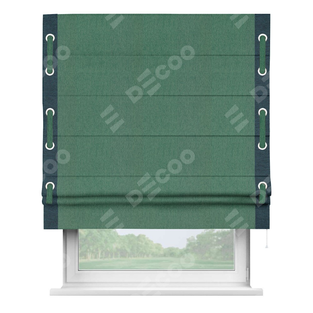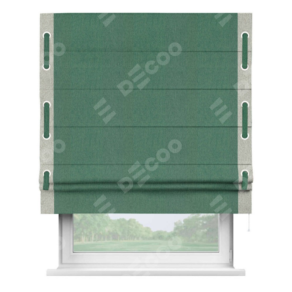 Римская штора производителя «Cortin», используется для проёма, пошита из ткани твид блэкаут глубокий зелёный, артикул 21589. Отделка шторы кантом «Стрим Дуо» на кантах расположены люверсы с пояском, ткань для канта используется из твида разной расцветки на выбор. Ткань для пояска обычно используется из основной ткани шторы, а так же можно сделать из любой расцветки по желанию. Имеет универсальный механизм и подходит для монтажа: на потолок, на стену и в нишу.