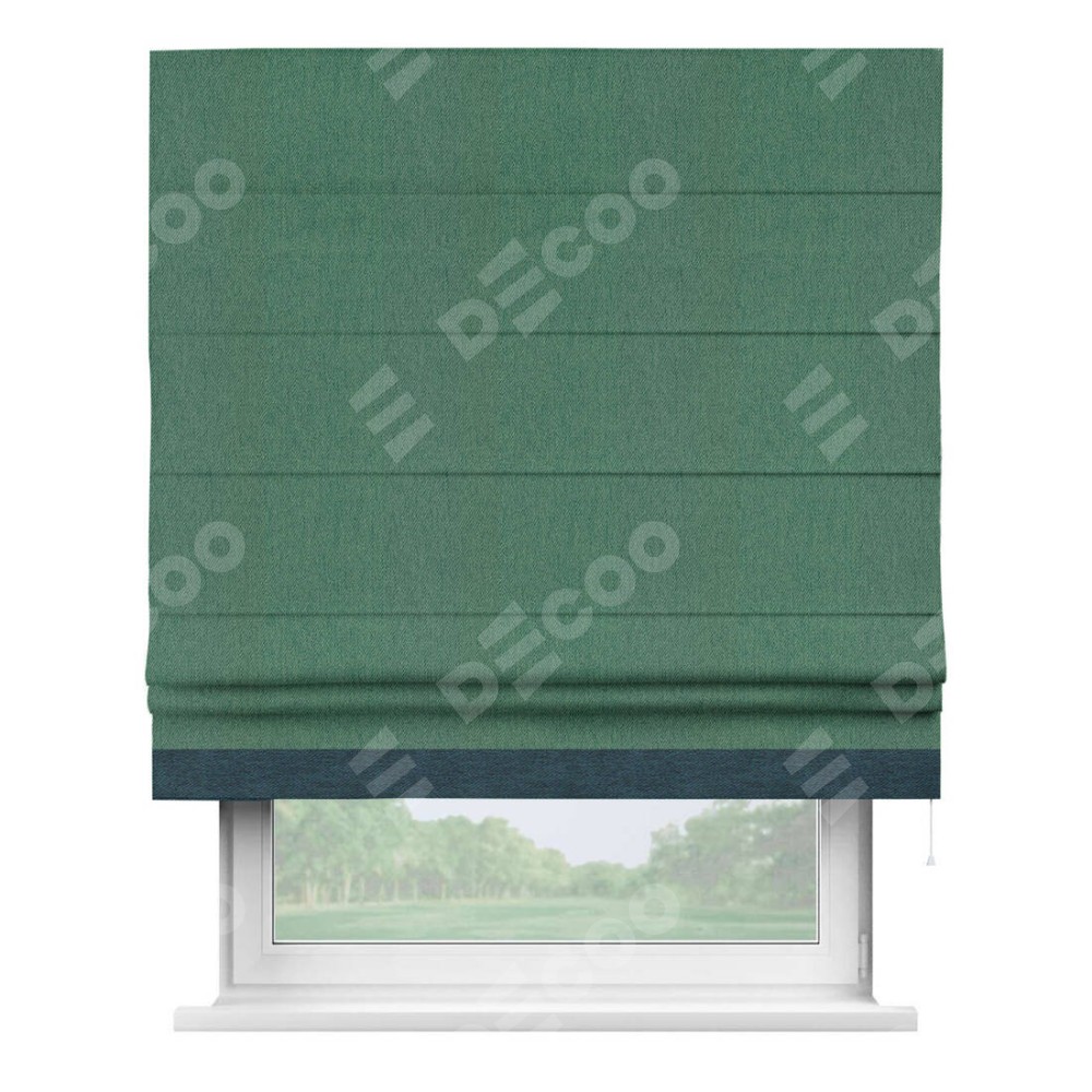 Римская штора производителя «Cortin», используется для проёма, пошита из ткани твид блэкаут зелёный, артикул 21589. Отделка шторы кантом «Джестер», ткань для канта используется из твида разной расцветки на выбор. Имеет универсальный механизм и подходит для монтажа: на потолок, на стену и в нишу.