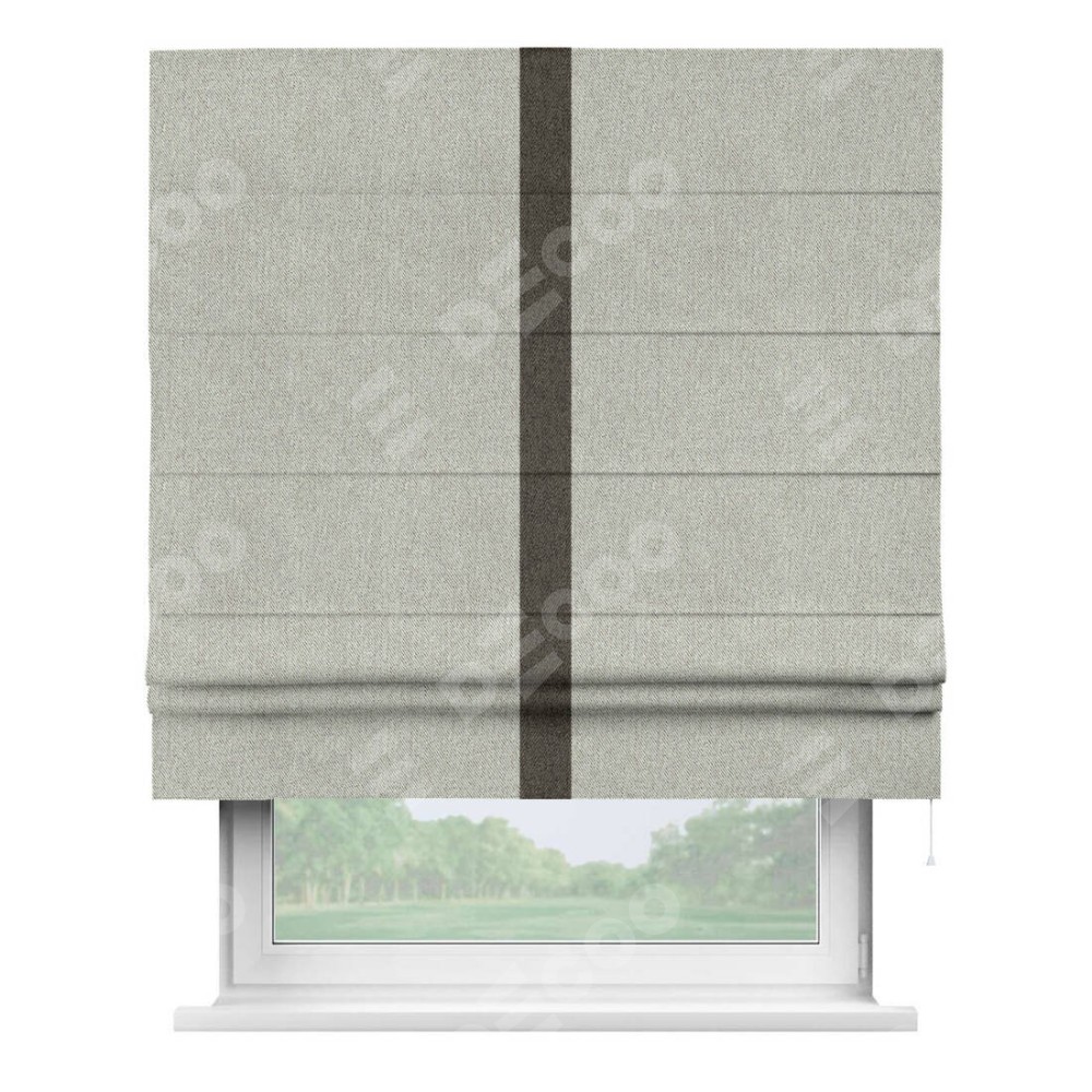 Римская штора производителя «Cortin», используется для проёма, пошита из ткани твид блэкаут коричнево-серый, артикул 21574. Отделка шторы кантом «Хайвэй», ткань для канта используется из твида разной расцветки на выбор. Имеет универсальный механизм и подходит для монтажа: на потолок, на стену и в нишу.