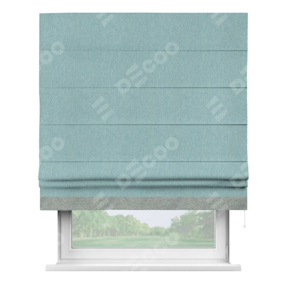 Римская штора производителя «Cortin», используется для проёма, пошита из ткани твид блэкаут небесно-голубой, артикул 21578. Отделка шторы кантом «Джестер», ткань для канта используется из твида разной расцветки на выбор. Имеет универсальный механизм и подходит для монтажа: на потолок, на стену и в нишу.