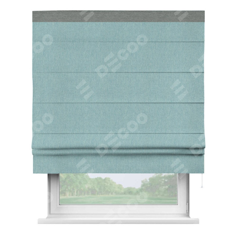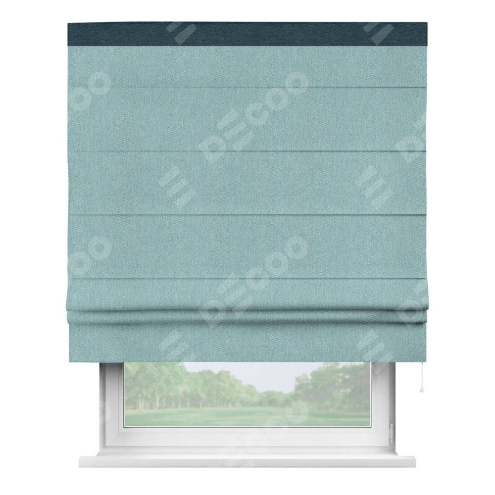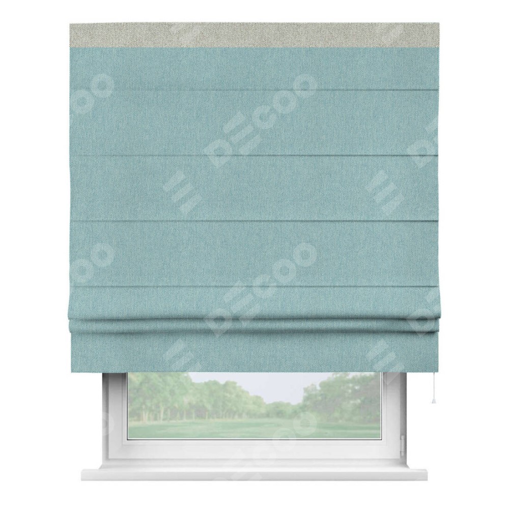 Римская штора производителя «Cortin», используется для проёма, пошита из ткани твид блэкаут небесно-голубой, артикул 21578. Отделка шторы кантом «Кинг», ткань для канта используется из твида разной расцветки на выбор. Имеет универсальный механизм и подходит для монтажа: на потолок, на стену и в нишу.