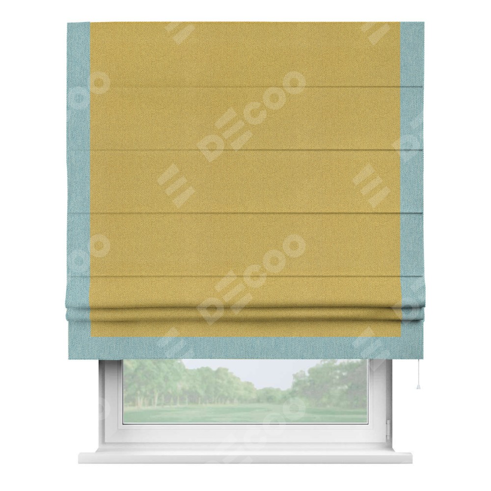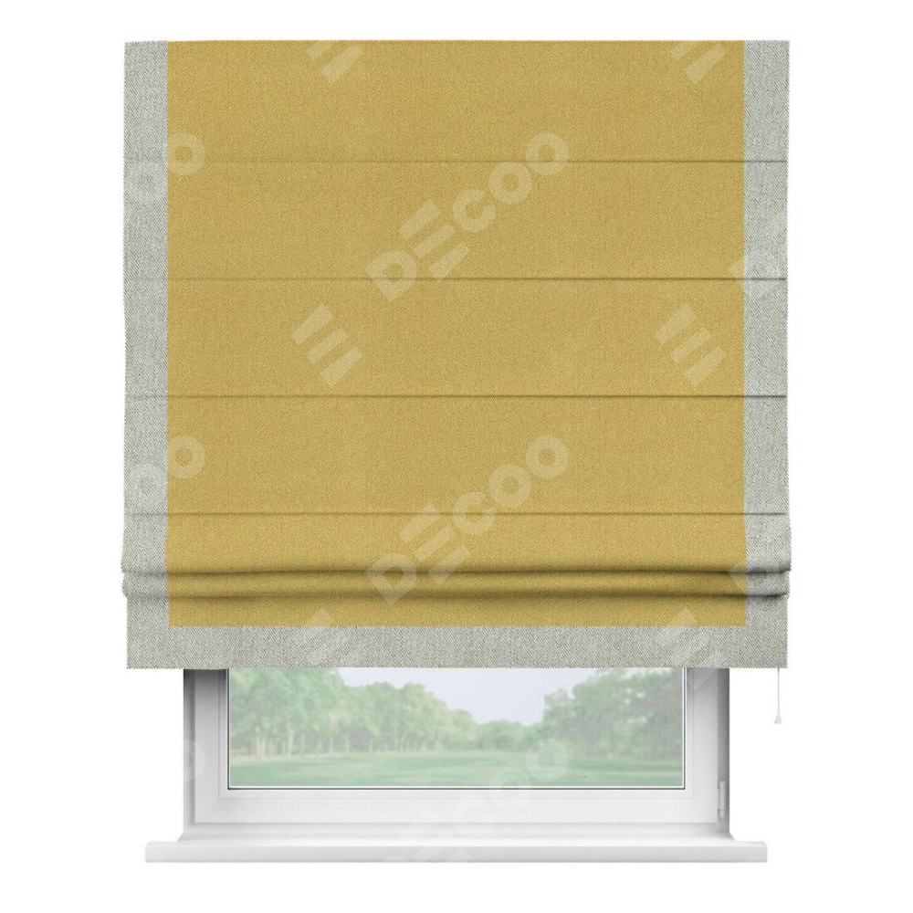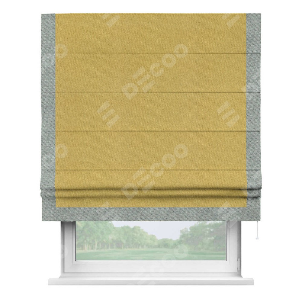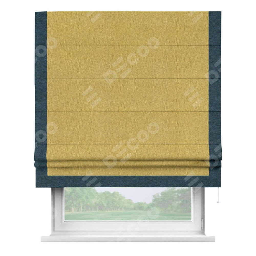 Римская штора производителя «Cortin», используется для проёма, пошита из ткани твид блэкаут пыльная горчица, артикул 21588. Отделка шторы кантом «Виктория», ткань для канта используется из твида разной расцветки на выбор. Имеет универсальный механизм и подходит для монтажа: на потолок, на стену и в нишу.