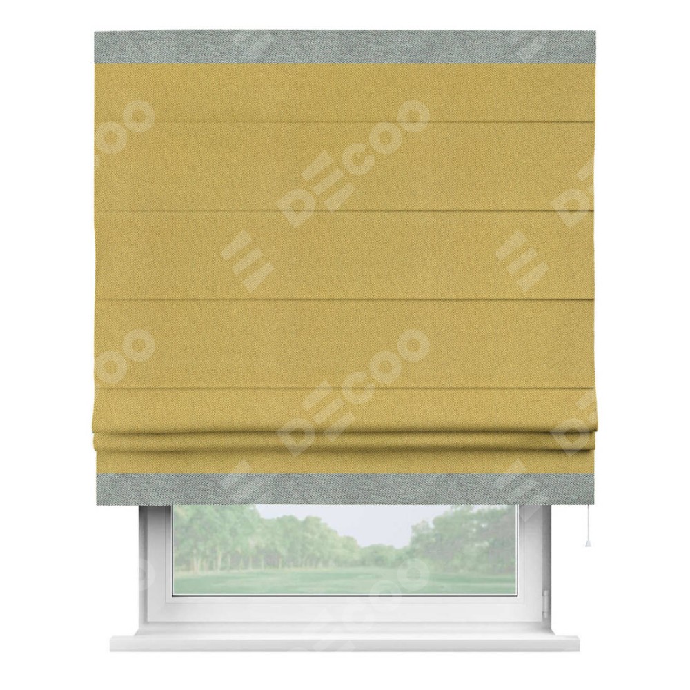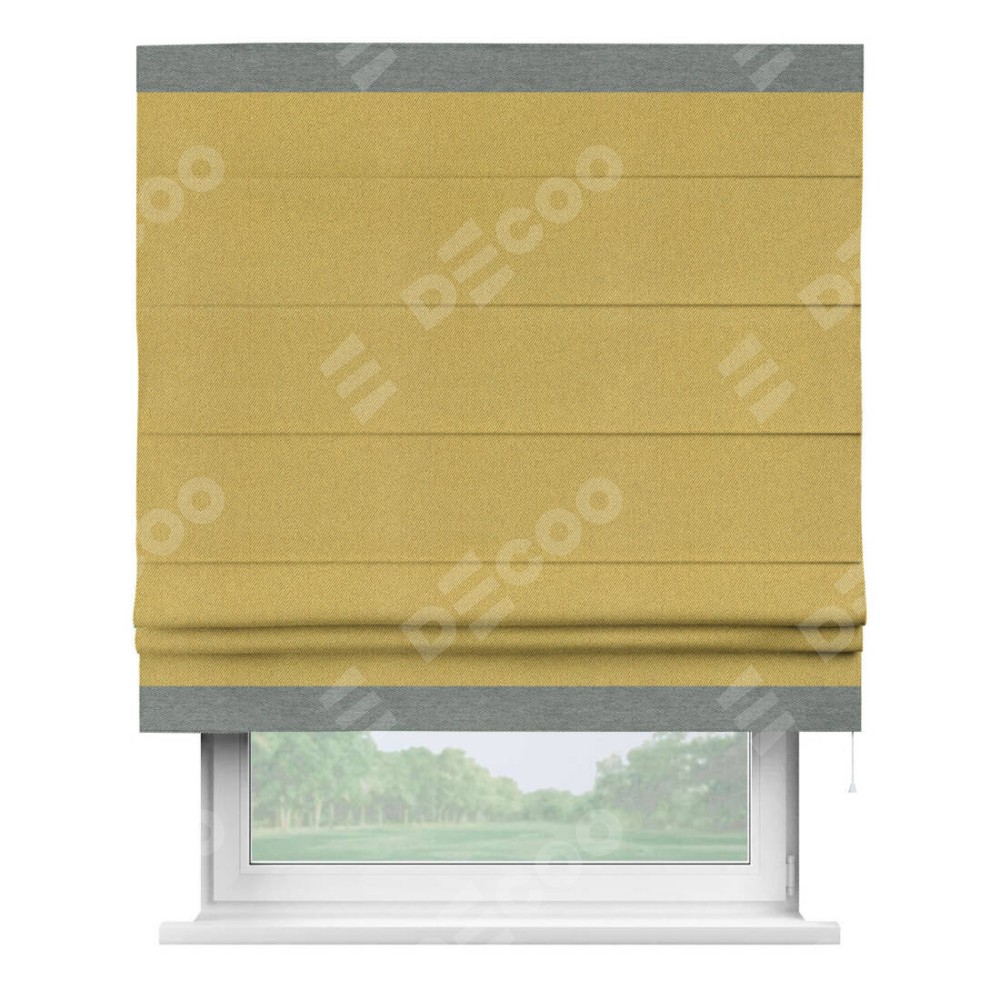 Римская штора производителя «Cortin», используется для проёма, пошита из ткани твид блэкаут пыльная горчица, артикул 21588. Отделка шторы кантом «Горизонт», ткань для канта используется из твида разной расцветки на выбор. Имеет универсальный механизм и подходит для монтажа: на потолок, на стену и в нишу.