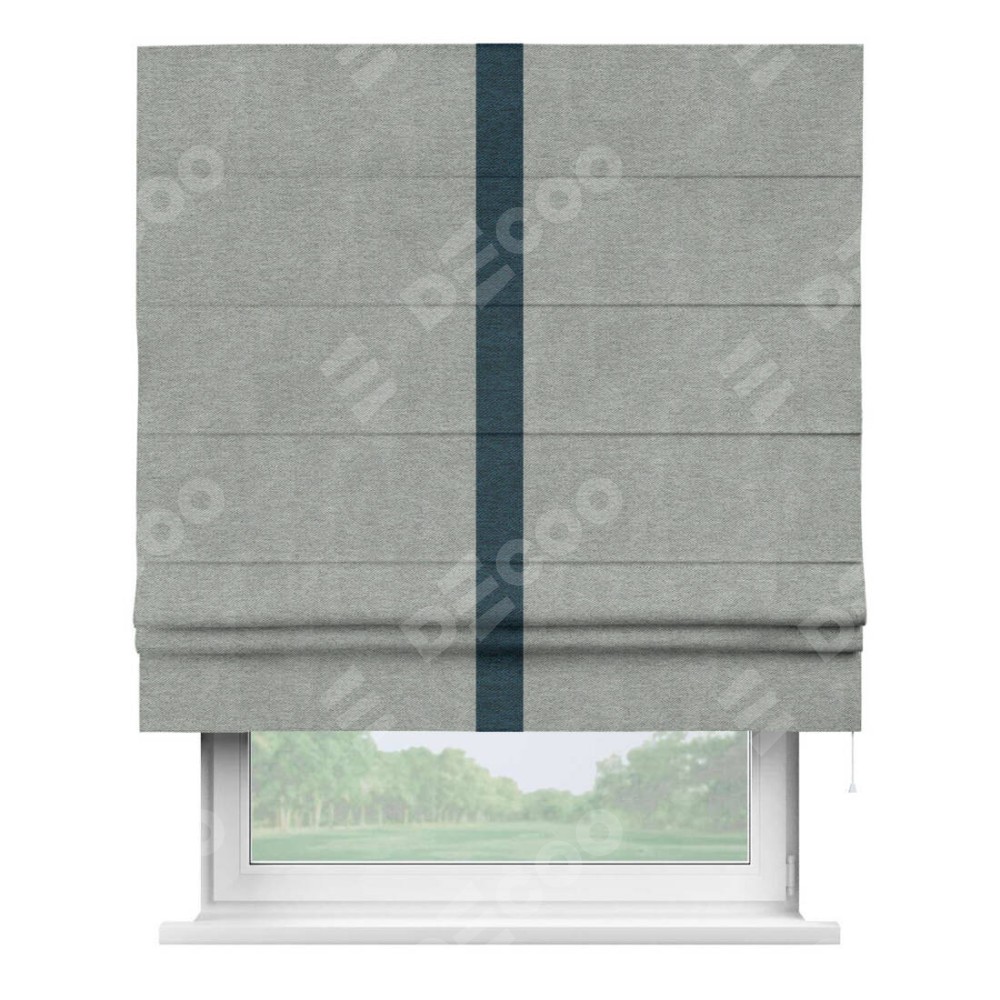 Римская штора производителя «Cortin», используется для проёма, пошита из ткани твид блэкаут светло-серый, артикул 21576. Отделка шторы кантом «Хайвэй», ткань для канта используется из твида разной расцветки на выбор. Имеет универсальный механизм и подходит для монтажа: на потолок, на стену и в нишу.