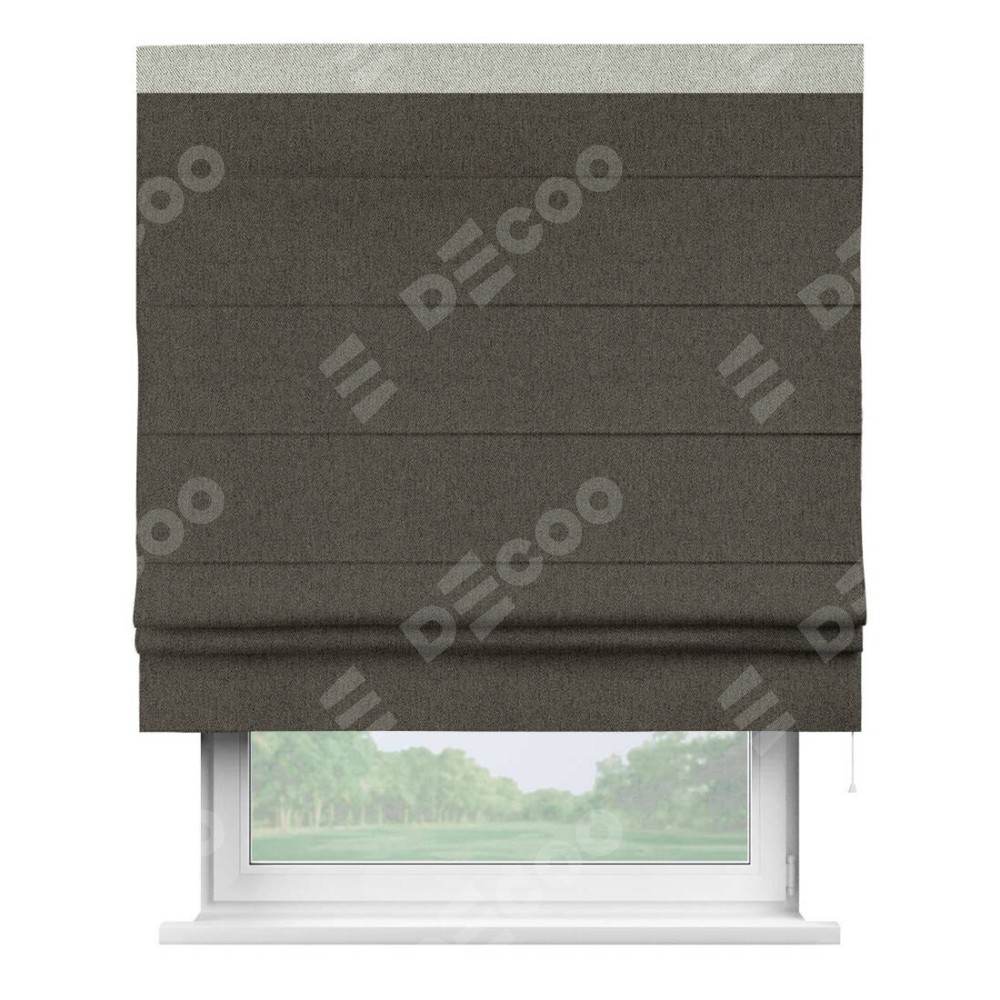 Римская штора производителя «Cortin», используется для проёма, пошита из ткани твид блэкаут тёмно-коричневый, артикул 21584. Отделка шторы кантом «Кинг», ткань для канта используется из твида разной расцветки на выбор. Имеет универсальный механизм и подходит для монтажа: на потолок, на стену и в нишу.