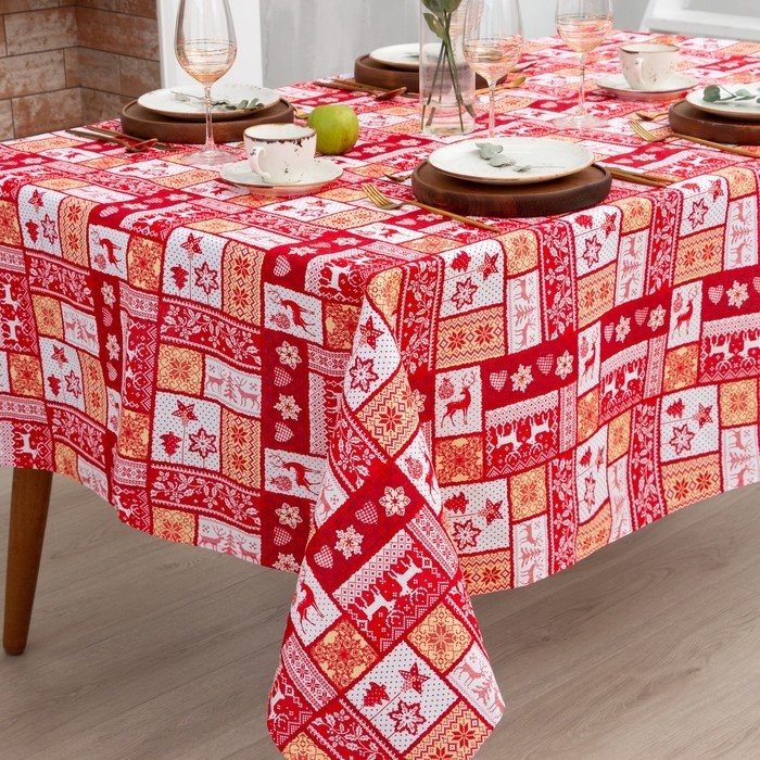 Скатерть от торговой марки «„Доляна“» украсит праздничный интерьер. Изделия с эксклюзивным принтом сшито из хлопкового полотна. Этот материал имеет плотную и упругую структуру, обладает высокой прочностью и на ура справляется с первостепенными задачами: