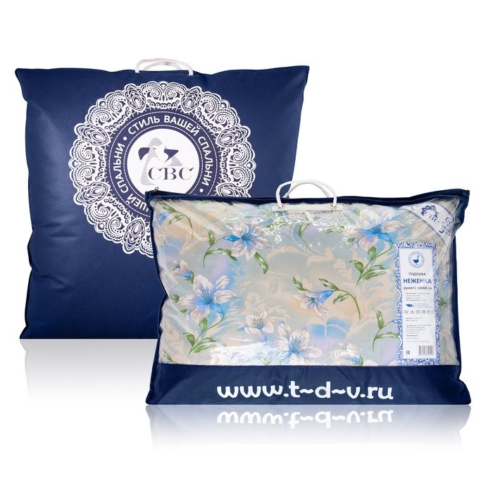 Подушка прочна, гигроскопична и воздухопроницаема. Ткань верха: пуходержащий набивной тик (хлопок, 100%); наполнитель: 40% — пух и 60% — перо водоплавающей птицы; атласная этикетка-уголок с логотипом «СВС» на сатине, кант.