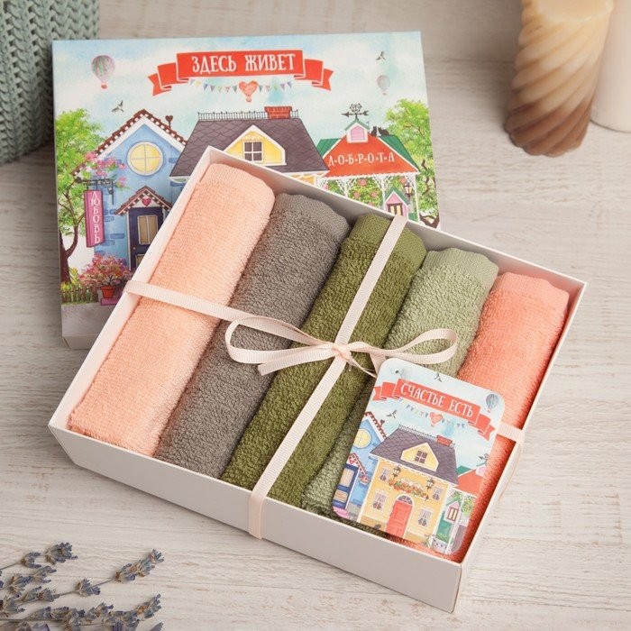 Набор махровых салфеток «Здесь живет счастье» 30×30 см -5шт